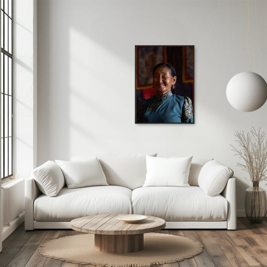 Mongolian Woman in Traditional Attire at a Temple
